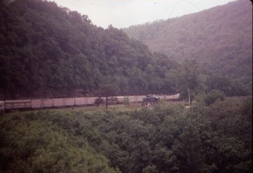 7/18/1990 The next morning I arose to find the train somewhere east of Pittsburgh on the former Baltimore and Ohio Railroad, now CSX main line and low clouds were obscuring the ridge line above the valley. I went to the dining car for a breakfast of French Toast as we stopped at Connellsville, Pennsylvania. By this time, I had finished my meal went to the lounge car before returning to the dome car as we reached Confluence. From here, the train followed the Casselman River towards Sand Patch. where the clouds were even lower as we gained elevation and there was barely enough light to take photograph a westbound CSX freight.