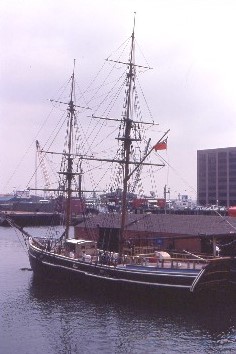 I boarded the next bus, which took me by the Boston Commons, by Harvard and the bar used for the outside shots on the television show "Cheers". The interior did not resemble the television version, but I had a drink anyway, and learned the bar in the show was a block away from South Station, so I knew where I was having lunch. Back on the bus, we went past the Hancock and Prudential buildings before we swung by the waterfront to the Boston Tea Party boat, where I again got off and toured the boat, paying a small price to thrown a phony bag of tea into the harbour. I returned to the bus to the end of its route, then walked back towards South Station finding "Three Cheers" and the bar exactly as it was on "Cheers." I ordered a beer, sat in Norm's seat and ate some buffalo chicken wings, the first time I had tried them.