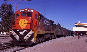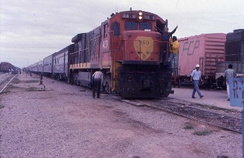 3/28/1991 The next morning, I awoke and went to the lounge car for my last day of service, relaxing for a few minutes as the train rolled down the Pacifico's mainline. Bill strolled in, looked out the window and said we should be in Empalme in twenty minutes. I went to get some hot water for coffee, returning in time to serve two passengers who had just walked into the car this early morning. When we arrived at the yard limits, I took my camera and detrained.