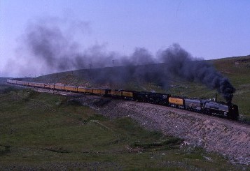Railfair 1991 in Sacramento meant that three large re-positioning moves would occur to bring the steam locomotives to the event, namely Southern Pacific 4449, Santa Fe 3751 and Union Pacific 8444 and 3985. Southern Pacific 4449 would travel from its home in Portland, Oregon, pulling an all-Daylight consist on a two-day trip. While I had tickets for Santa Fe 3751's excursion from Barstow to Bakersfield over the Tehachapi Loop, it did not happen because the engine was not finished its restororation; that trip occurred in December. The double-headed Union Pacific steam excursion from Portola to Sacramento, jointly operated by the Central Coast Chapter of the National Railway Historical Society and the Feather River Rail Society was a one-way trip and I bought my ticket through the the latter group as I was a member. My ticket included a bus trip from the Sacramento Amtrak station to the Holiday Inn in Sparks, the next morning a bus to Portola, the journey through the Feather River Canyon and the Sacramento Valley to the former Western Pacific yard in South Sacramento and a return bus to Amtrak.