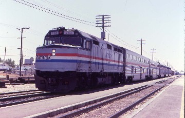 After about thirty minutes, here came 3751 and the all-private car train travelling east through Fullerton. I said goodbye to my father, who could not believe I was going to be riding behind that engine tomorrow then walked over to the station to wait for the Desert Wind and boarded. The conductor could not believe I was just going to Barstow instead of Ogden, until I told him that I was riding behind 3751 tomorrow to Bakersfield and he wished he could be going with me. We proceeded east through Santa Ana Canyon until Colton, where I went on 3751 alert and took the "short way" to reach San Bernardino, where, holding the mainline in "A" yard was 3751 and its train, waiting patiently for us to do our station work.