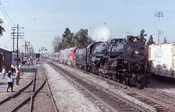 After drifting downgrade since Tehachapi, 3751 had to work up the short hill to Sandcut and once at the top of that grade, 3751 had reached the San Joaquin Valley for the rest of the journey to Bakersfield. The parallel road was jammed with chasers and at every grade crossing, people were gathered to watch our steam train. We passed through Edison with its agricultural pursuits before the outskirts of Bakersfield, where more people were out as we reached Southern Pacific's Bakersfield Yard, then a few minutes later, arrived at Kern Junction, where we left Southern Pacific rails for the home rails of Santa Fe. We travelled due west for over two miles through downtown Bakersfield to the Santa Fe yard and the Amtrak station, where our excursion came to an end.