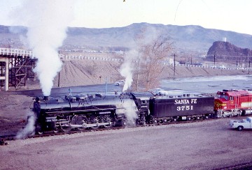 This special excursion's consist was Santa Fe 4-8-4 3751, Santa Fe FP45 97, Santa Fe FP45 95, Santa Fe combine 1517, combine "Santa Cruz", Santa Fe 10-6 sleeper "Palm Leaf", lounge car "Overland Trail", New York Central sleeper "Norma Petersen", Union Pacific sleeper "Regina Wendt", Canadian National lounge-sleeper "Belle McKee" (nee Cape Brulé), Pennsylvania Railroad sleeper "Colonial Crafts, Canadian Pacific baggage/horse car "Pony Express", Union Pacific sleeper "National Forum" Denver and Rio Grande Western "Eagle Canõn", tavern-lounge 113 "Pere Marquette", unnamed observation-lounge, Seaboard dining car "New River Gorge" dome-coach "Silver Garden", Santa Fe dome-lounge "Plaza Santa Fe", and California Zephyr dome-observation "Silver Solarium".