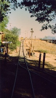 This two foot gauge railway is typical of many industrial and mining operations and is full-size and not a scale model. The track is constructed of used light rail number 12 to 20, tight curves - 10 foot minimum radius and steep grades of 6.5 percent. The rail came from a number of now abandoned operations: the Warlock Mine in Mojave, California, "a mine in Utah", the Rand Mining District in California, the Poway-Midland Railroad (too light for their use), the Warlock and Blue Mount Mines in Julian, California and Border Field in Imperial Beach.