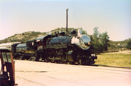 Southern Pacific 2353 9/21/1996After that fantastic visit, Jeff and I drove about an hour southeast to Campo, where we spotted Southern Pacific 2353 steaming away as we approached. Since I had just rejoined the museum as a member, our excursion behind this newly-restored locomotive was complimentary. I was surprised to find Bill Wallace, owner of Bananafish Tours, here and we discussed his next Copper Canyon excursion in December.
