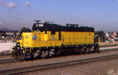 I was standing on top of a hill overlooking the San Diego and Imperial Valley Railroad yard waiting for the power to come down to our train. On a local bound for Mexico was San Diego and Imperial Valley GP7u 2168, ex. Santa Fe 2168,\ nee Santa Fe 2800, built by Electro-Motive Division in 1952, which stopped at the border gate then entered the country.