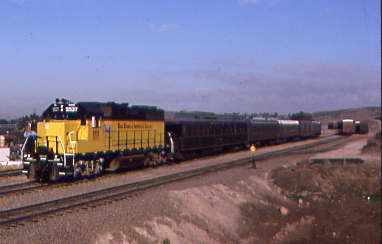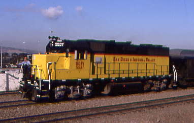 San Diego and Imperial Valley GP38 5537, ex. Conrail Leasing 342, exx. Pittsburgh and Lake Erie 2037, exxx. Conrail 7766, nee Penn Central 7766 built by Electro-Motive Division in 1969, which would lead our train.