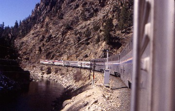 The Zephyr passed through the beautiful Red Rock Canyon on its way west on a flashing yellow signal then at Range, we had a yellow-over-red signal with Denver and Rio Grande Western 5349 East sitting in the siding. Range lived up to its name as ranching is the main form of business in the valley. Amtrak Train 6, which we would normally meet at Dell when both trains are on time, waited behind him then minutes later, we passed some beautiful aspen trees along the bank of the Colorado River before meeting a BNSF freight at Dotsero. The public address system came alive with music as the train made its passage through Glenwood Canyon, enhancing the scene and the river was running at its normal level through the shadows of the canyon. We departed there two hours and twenty minutes late.