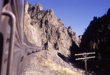 Twenty-five minutes west of Glenwood Springs, the 5:00 dinner reservations were called and I was seated with a husband who runs a correctional institution in Oregon, along with his wife, a nurse. She had a son who would not admit that he has a problem with alcohol and when she found out in our conversations that I was indeed an alcoholic, asked me all sorts of questions about myself and I provided here with answers as I never mind talking about what I truly am or anything on that subject. If I can help someone understand about alcoholism, I am performing a service and that is what a part of AA is, service to others. I had a nice steak dinner through all of the discussion before the servicing stop at Grand Junction, where I was able to have a nice after-dinner walk. We left town and I watched "My Best Friend's Wedding" as we passed through Ruby Canyon on a moonlit night, stopped briefly at Green River, Utah and departed there two hours and eight minutes late, where I called it a night.