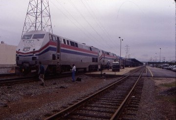 Sunset Limited 2 10/13/1997Would this train arrive in Jacksonville, Florida, where I was connecting to the Silver Palm, on Day 999 or Day 1,000 of my sobriety? The conductor believed the connection should be very easy and we left town still under the blanket of night, with Amtrak providing a free breakfast of eggs and hash browns. Since I cannot eat eggs, I was given a dinner roll, some bacon and a cup of tea then stopped at the lounge car for some cookies to fill me up. It was an overcast morning as the train proceeded east, escaping the realm of New Orleans without any more delays and crossed the waterway to Bay St. Louis, Mississippi. The Gulf of Mexico was windy and by Gulfport, we were engulfed by a heavy downpour but I was enjoying this journey as it should all be in daylight with no further delays almost all the way to Jacksonville. We stopped next in Biloxi then made our way to Pascagoula where offshore oil platforms are built. As we made our way through the forests to Mobile, Alabama, I reflected on the greatest gift of train travel, which is the ability to sit back and take the world in as it passes outside the window. This morning, it was all too soon that the Sunset left the forest and paralleled the harbour to reach our next stop at Mobile and we had made up twenty minutes.