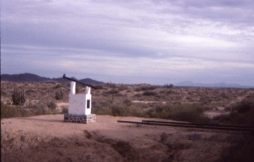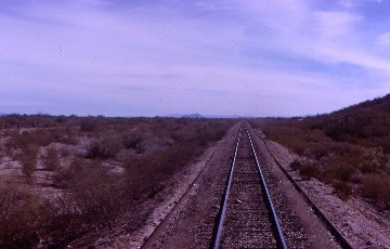 Upon departure, I sat in the lounge noticing how far east we had travelled but could still see the Sea of Cortez, after which we passed the Golden Spike Completion Monument but I was not quite quick enough to get it at the best angle. I took a folding chair to the rear vestibule watching the miles fade and sat there all the way to Benjamin Hill except to stretch my legs at Caborca while we met our westbound counterpart. I had not realized how straight the Sonora–Baja California tracks were and how few curves there were and counted the kilometers to Benjamin Hill, where we arrived ten minutes early. As the train from Nogales was not due for thirty minutes, I detrained and walked with Anna to the liquor store so she could get some coffee liqueur for her sore throat. We returned to the train, went straight to my room and drank a toast to our trip, Anna with her drink and me with my 7-Up. The train from Nogales then arrived and joined our two cars from the Mexicali section and off down the former Ferrocarril del Pacífico tracks we went.