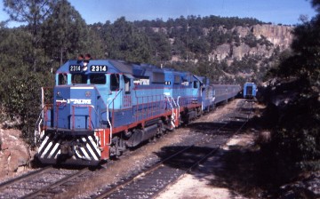 Ferrocarriles Nacionales de Mexico GP40-2 2314, nee Sonora–Baja California 2314, built by Electro-Motive Division in 1982, leading our train. During our stop, I bought Maureen some more assorted Chihuahua rocks while Anna bought more baskets. While we were there, the open car was added to our consist, although it would only be until San Rafael, but I was glad to have it back if only for of a short time. Since we departed Creel, our train had eight cars, ours on the front, the Mexican coaches and a sleeping car from the Roaring Fork Railroad on the rear. At Divisidero, the open car was added in front of ours and the cars of the Sierra Madre Express on the rear, thus making us a long fourteen-car train.