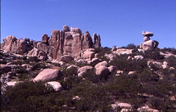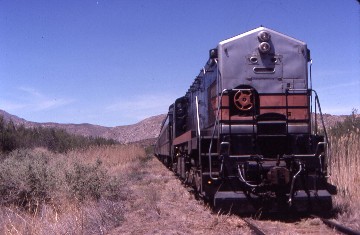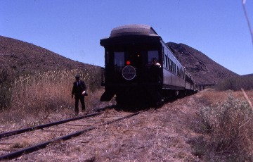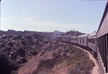 The steel bridge is 600 feet long and 180 feet above the creek and we slowed to almost a walking speed so that all passengers could have a good view from both sides with the highway far below. We came off the bridge and the boulders, so common to this part of Southern California, increased. The train curved as it proceeded south towards the Mexican border before we made a big horseshoe curve to the east then climbed the last few miles to Hipass, cutting through the Rattlesnake Mountains with Tierra de Sol to the north. We curved to the north before running east between the boulder-strewn hills then turned to the south at the foot of Goat Mountain.