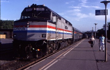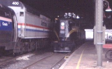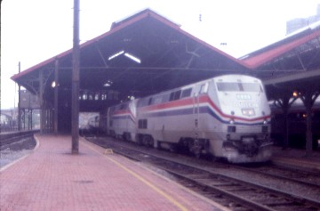 6/16/1997 Once we arrived in New York, the crew changed again and this time a female conductor apologized to each passenger for the trip from Philadelphia, allowed everyone to stretch out in the empty seats and to have a pleasant night's sleep. We, the passengers, had a good laugh and a quick discussion about our journey so far then I stayed awake through the East River Tunnel, passed Sunnyside Yard and over Hell's Gate Bridge with an outstanding night-time view of the entire New York City skyline before I fell fast asleep. I slept through New Haven, another crew change and awoke in Providence, Rhode Island where I prepared myself for the day before we departed. An MBTA, commonly known as "T", commuter train departed in front of us so it was announced that we would arrive in Boston at 8:30 AM. So much for going back to New York via Springfield as I needed to reclaim the Boston-to-Springfield segment for my sobriety, as I was doing on this trip from New York to Boston.