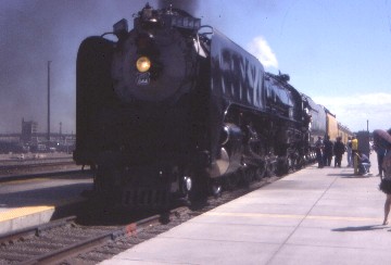 Union Pacific 844 entered the station first with us reversing in on Track 1. I detrained and rushed to the front of the excursion train and talked to Steve Lee, engineer and director of the Union Pacific Steam Program. He offered to take me along but I was not prepared for such a trip on the spot and wished that I could have participated in that three-day excursion to Salt Lake City via the Royal Gorge and Tennessee Pass, but tickets sold out instantly. I went inside the station and bought and mailed some postcards.