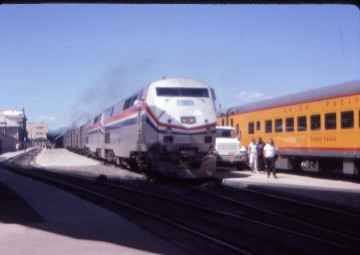 San Diegan 781 6/12/1997I boarded this train for the journey to Los Angeles and found a seat in an Amcafé car, which gave me a front row seat to the heavy drinking activities of four groups of passengers was as a reminder of my former self. As they left the train at Anaheim for the baseball game, I cleaned up their areas back to my high standards then detrained at Los Angeles, walked over to Metrolink 608 and briefly talked to Leonard, an Amtrak engineer and a key player in the San Diego branch of Operation Lifesaver, then went into the station and started the queue for the Southwest Chief.