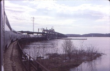 The Crescent 19 4/16/1998My brother Bruce, the Amtrak agent in Sacramento, once said, "A train has to stop some place in the middle of the night" and tonight, it was in Charlotte. The Crescent arrived twenty minutes late and I was assigned a window seat on the right then stretched out across both seats and napped until Gastonia where passengers knew they were supposed to detrain, but the attendant thought that Gastonia was after Spartan, South Carolina and told them to go back to sleep. I had to show the attendant my Amtrak national timetable to prove the passengers were correct. I walked to the lounge car for a few cups of tea as I waited for the dining car to open where I had the best pancakes and sausage on Amtrak. On the way back, I bought a Crescent polo shirt then watched the moon and clouds play a little hide-and-seek. The Norfolk Southern mainline was extremely busy and we stopped at Tarber to let one freight train pass on the mainline then we crossed Lake Keowee just west of Clemson before crossing the Tugaloo River into Georgia. We had been travelling all morning on a layer of the Appalachian Mountains as the railroad runs across fills and through rock cuts.