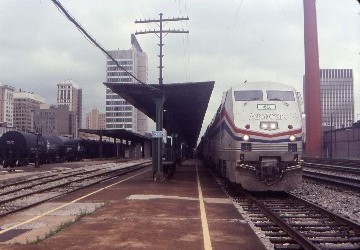 Sunset Limited 1 4/16/1998Following a good night's rest and ride on the St. Charles Streetcar line, I taxied back to Union Station to wait for the same Sunset Limited equipment I had seen in Winter Park, Florida then wrote and mailed postcards and talked to Jeff for over an hour waiting for the late-running Sunset Limited to arrive. We started the queue to board at Gate B and soon other passengers joined us but everyone had to wait until the City of New Orleans's passengers boarded and departed before it was our turn. Alex Popadopolous, once of San Diegan service, was our conductor as far as Houston and we exchanged greetings in the process. Departure time had come and gone by the time I was in my usual window seat when a man going to Tucson was seated next to me, who started his trip in Oakland and had been travelling around the country just like I was. It was then announced that we were going to be here a while longer and could detrain if we wished.