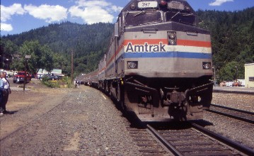 Our train at Dunsmuir, led by F40PH 387. After a relaxing interlude, it was all too soon time to return to Sacramento and the journey back down the canyon was beautiful.