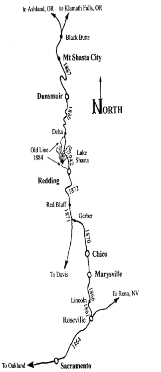Mount Shasta Daylight 880 Route Information from the museum's handout 6/20/1998Our trip will take us up the Sacramento Valley to Redding, where the train then follows the Sacramento fuver Canyon to Dunsmuir. From Sacramento, we travel northeast to Roseville. This part of the line was first laid from 1863 to 1864 as part of the Transcontinental Railroad. At Roseville we turn north on a section that predates the Transcontinental Railroad, built in 1861 to Lincoln. From here to Redding the tracks were first laid by various companies, each only going a short distance until they went bankrupt or were bought out by another. Rails reached Marysville in 1868 and Chico in 1870.