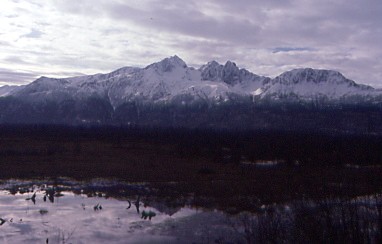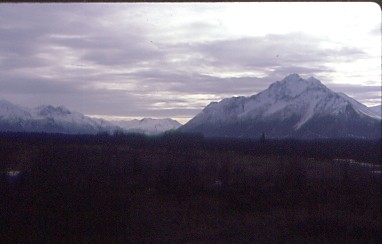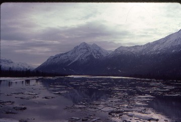 The train reached the crossing of the Knik River with floating ice and the mountains reflecting in the water, making a most beautiful scene. As the train passed through Birchwood, Twin Peaks and Pioneer Peak, all came into view.