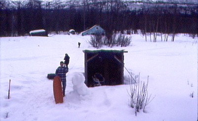 At Milepost 244, we stopped for a family with a half-built snowman standing guard and a shelter with a chair, a deluxe flag stop with their cabin a quarter of a mile away. Conductor Steve had a cabin along the tracks and we stopped to drop off his daughter Carrie at a neighbour's house for the night.