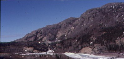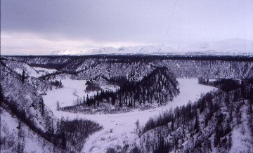 This was the start of the train's descent of thirty-two miles through the Nenana River Canyon. The River was frozen and made for a beautiful scene near Oliver at Milepost 342.7.