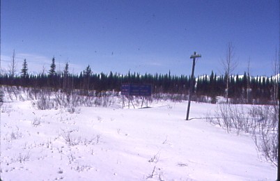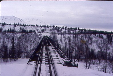 It also marked the completion of the Alaska Railroad in 1923 and the Golden Spike was driven by President Warren Harding on July 25, 1923. Mount McKinley could be clearly seen in the distance and further north at Dunbar at Milepost 43.6, a -70 degree Farenheit temperature was once recorded. The train passed through the low hills with Taiga trees abounding then at Saulich, we encountered a track grade problem where a culvert was still frozen and the water was seeping through the fill, causing our train to gingerly creep across this section of track.