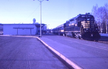 From Dome to Fairbanks, the tracks turned to the southeast and were built on the narrow gauge railway of the Tanana Valley Railroad, which for years had a third rail for the narrow gauge trains. We passed the University of Alaska, where a gas-electric passenger car, the Toonerville Trolley, once provided a way for students to get from Fairbanks to the school. The Aurora crossed the Chena River before entering the yards of the Alaska Railroad in Fairbanks and we passed the railroad's northern shops before stopping on time at the depot, the end of the northbound trip at Milepost 469.8.