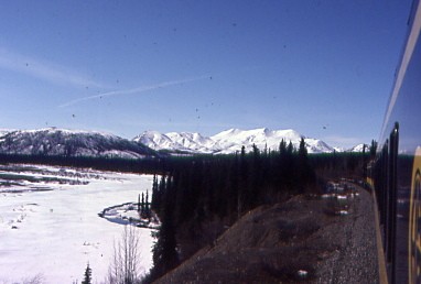 We passed Elmendorf Air Force Base, which is the largest in Alaska. Off to the right were the Chugach Mountains, the ground was covered with a blanket of snow and the high forties-degree temperatures allowed limited Dutch door riding, which is where I took pictures then explored the train, ending up in the rear open vestibule before returning to the warmth of the inside.