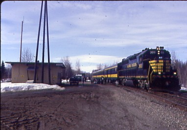 The branch line to Palmer took off at Matanuska, Milepost 151.0 before we crossed the river with the same name. The views that looked east up the river valleys were very impressive then the tracks turned to the west towards Wasilla, which is a regional center and has the world's largest fly-into mall. There are more airplanes than cars in Alaska. Wasilla is one of those palindromic names which if you reverse, becomes "All I Saw." Wasilla is also the home of the Museum of Alaska Transportation and Industry, which has a large railroad collection.