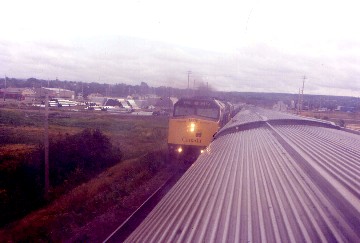 8/16/99 The next morning dawned perfectly clear so I went to the dome for the rest of the journey from Charny. A group of Canadian exchange students returning from Halifax to their hometowns had every seat taken except one. VIA sent a Student Exchange Newspaper up and it was interesting to listen to their stories that went along with each. I also listened to their wide topics of jokes, some good, others not so. One of the boys spotted the flying saucer at one of the parallel freeway exits and no one believed him and while I saw it, did not want to spoil their joke on him. At Saint Lambert, I returned to my seat to pack and since we did not have the Chaleur today, pulled straight into Central Station.