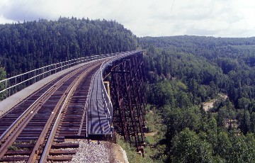 We climbed high on the valley's south slope and at Milepost 95, crossed over the Rivière du Milleu viaduct, the highest bridge in eastern Quebec at 196.1 feet above the river, which reminded me of the Clio Viaduct in the Feather River Canyon in California. At Milepost 117, the Abitibi went through a seven hundred foot tunnel and a few minutes later, we arrived at La Tuque where we picked up more passengers, their backpacks and a canoe. It was here where our route turned to the west. As we departed, we passed Lac Tuque then climbed a line relocation and through another 769 foot tunnel before passing a large hydroelectric plant seen through the trees. We followed its lake for many miles with it again reminding me of the former Western Pacific route through the Feather River, then crossed the lake on a truss bridge and a few miles later, crossed the river again on a high bridge where we stopped to let some backpackers off at a very good fishing hole, so I was told. We passed several more lakes and stopped at McTavish to drop off and pick up a few more passengers.
