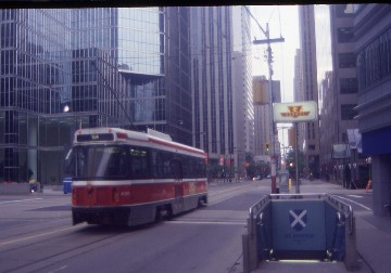 Toronto 3 8/20/1999Upon detraining, I went straight to the Ontario Northland Railway's office, which was still open, to get some information for next summer's trip then picked up some Church's Fried Chicken to go before returning to the subway. I learned how to do it on this end, paid the machine, received a transfer from it and took the subway one stop to King Street. It was pouring rain when I emerged on the street and now my umbrella decided to have a major problem and would not open, something that only happens when you need to use it. I waited to board the second of the two streetcars in a two-car consist and was off to just past my motel, where I made a mad dash to the dryness of my room for the night.