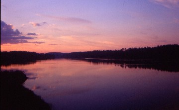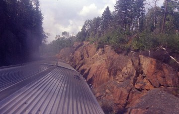 The dome conversations ranged from sports, mainly baseball and hockey, to computers, politics, Weird Al, horror movies and Jackie Chan. We arrived at Sudbury Junction where a music student that I met detrained to start her final year of college at Sudbury. The landscape had changed to a more rock-faced bluff bare of trees from the acid rain produced by the area nickel plants. After passing another lake, we arrived at Capreol, a servicing stop and here some people made a mad dash to a store half a mile away for cigarettes. In my old days, I would have been making my dash for alcohol but, God willing, those days are over forever. I did have a good laugh at just the thought doing that.