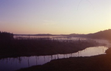 8/21/1999 Morning came all too quickly with us still in the rocks and trees of the Canadian Shield as we proceeded due west from the morning's sunrise. The morning started with a find the bathroom game and breakfast in the Skyline car of pancakes, sausage and grapefruit juice, all for a very reasonable price. I followed that with a full day of dome riding, starting with the fog rising from the lakes then at Lamaune, we passed the first Canadian National freight of the morning then proceeded to Armstrong where everyone waved to Dad and Betty, the father and a friend of a family who had just boarded the dome car as there was still a lack of coach seats. We then went into the siding at Onaping for Canadian National 166, the very hot Vancouver-to-Toronto intermodal train. I had been seeing trees attempting to change into their autumn colours and learned that they were birch trees, the only ones on the outside of the forest, so I wondered if it was because they were not insulated from the night's cold air as their brethren were, and also learned that the red flowers were Mountain Red Ash berries.