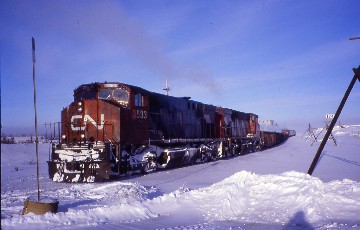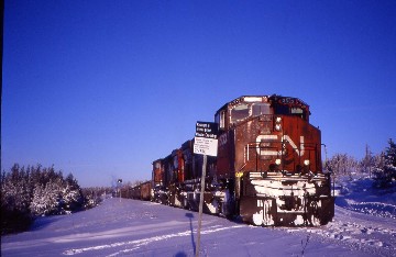 12/17/1999 Midnight passed as the train set out a string of section cars (online workers' living quarters) waiting for their next assignment. I had now been on this stretch of railroad for three calendar days. As we approached The Pas, the crew informed me that they were going to die on the law at 1:20 AM and that a new crew would be waiting at a grade crossing at Prospector, so if all went according to plan, we should be in The Pas by 1:45 AM. The crew change took place and in no time we were moving again as our former crew had jumped into a taxi for town while I rode the 10.2 miles to The Pas and I was all packed and ready to go, but first we had to set out some cars at the plant outside of town before we arrived at the station at 2:16 AM. I detrained, walked the five blocks quickly in a very strong wind chill breeze, talked my way into the Rupert House (they locked their doors at 2:00 AM), received my room, showered and hit the sheets for a very well-deserved rest.
