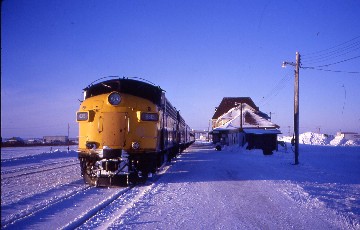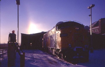 12/20/1999 I slept late as I had checked for the Northern Lights on and off again with my now famous same results then had my usual breakfast as we returned to the Canadian National mainline at Portage La Prairie. The sun came up through some mid-level clouds that gave the illusion of three suns rising; what an interesting solar system that would be in which to live. It was another clear and very cold day as we approached Winnipeg but the whole journey to Lynn Lake and Churchill had been an amazing and I learned and saw how man has adapted to life in the Tiaga and tundra environments. I lived and adjusted to it, thanks to good planning and the correct selection of clothes and had met many special people and had wonderful experiences. Our female chef stopped by my room for a few minutes and shared some knowledge of Winnipeg with me. This dream trip was completed in a few more miles with a 9:00 AM arrival after we stopped for fifteen minutes due to a frozen switch and for once in my life, I was ready for a three-day and two-night stay off a train. The chefs last duty was to sweep the snow from the vestibule stairs so I could detrain safely, proving that VIA gives excellent service to the passenger right to the end of their trip.