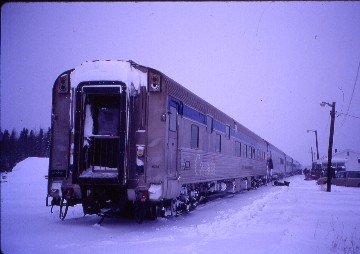 VIA 5 The Skeena 12/25/1999Since it was Christmas Day, I must confess that this whole trip is a Christmas present to myself and was my first Christmas away from home and my first White Christmas, so now I understood its allure. As I stood on the icy platform waiting for the train reverse in, I thought about the fact that this was my fifth sober Christmas and what a waste those other Christmases were. To quote Tull, "The Christmas spirit is not what you drink!" I was completely grateful to God for my sobriety and thankful for every sober day of my life, including today, Day 1,802.