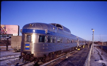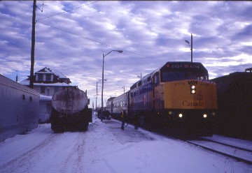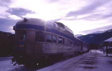 VIA 1 The Canadian 12/22/1999The Canadian finally arrived at 7:02 PM following a forty minute servicing stop for fuelling and cleaning, the Silver and Blue sleeping car passengers boarded, then families with small children, followed by the rest of us. Being first in line gave me a choice of seats and I chose a full window seat on the right and was joined by a delightful lady whose main hobby was riding roller coasters. Anytime in the future when I hear Jethro Tull's song "Big Dipper", I will think of her. She was going home to Melville, Saskatchewan for Christmas with her family and liked Monty Python, so we spent a wonderful evening together in the dome waiting for the last and largest full moon to appear. Not only was it the last full moon of the century, it was also at its closest point in its orbit to Earth, making it appear to be 10 percent larger. Moreover, it was also the first full moon in 120 years to fall on the winter solstice, the shortest day of the year in the Northern Hemisphere. The moon was spectacular and we returned to our seats for some shut-eye. Just before Melville, we said our goodbyes along with 'Merry Christmas and a Happy New Year'. My next seatmate arrived, a gentleman going to Viking to see his ex-wife, children and grandchildren. I twisted and turned by him with the saving grace of a hotel room in Jasper on Day 1,800, which it now was.