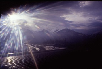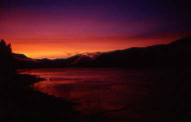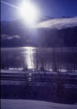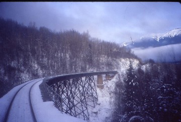 VIA 6 The Skeena 12/26/1999The train departed on time still in the darkness of the long winter night and passed the ferry docks where the cruise ships dock on their journeys along the Inside Passage, then past Ridley Island where coal and grain trains empty their cargo for ocean-bound voyages to Pacific Rim countries. Smith Island came into my dawn view as we ran along Chatham Sound in Telegraph Pass before we paralleled the Skeena River up what I would call a fjord. Skeena means "Water of the Clouds" from native Tsimshaind or "River of the Mists" from the native Gitksan.