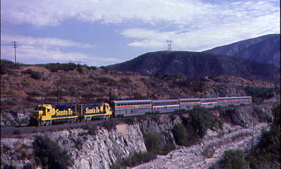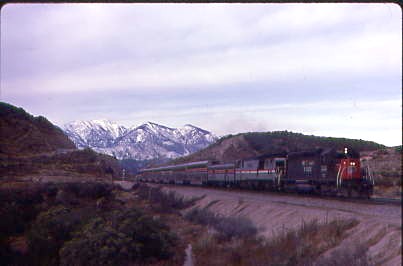 The Southwest Limited on a bad day at Blu Cut in Cajon Pass. A little mishap at Victorville caused the freight power to be added for the trip to Los Angeles. 1978
