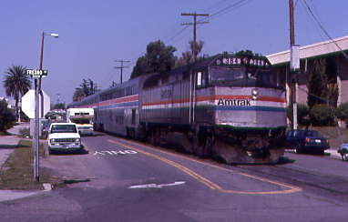 Amtrak San Joaquin 708 runs down the street at Fresno in 1987.