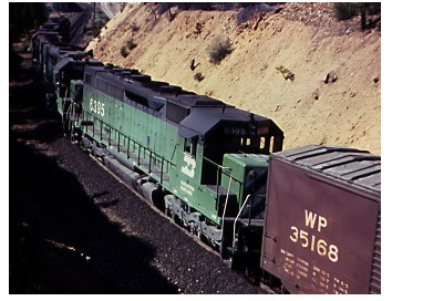 BN 2080, a GP-38-2 led an Inside Gateway joint WP/BN train at MP2 north of Keddie,Ca in August of 1976.