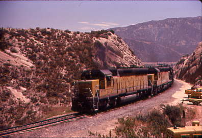 UP GP-35 761 drifts down Cajon Pass at Cajon in 1974.