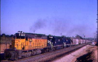 UP SD-40 3015 leads two Missouri Pacific SD-40-2's westbound through Streetor in 1979.