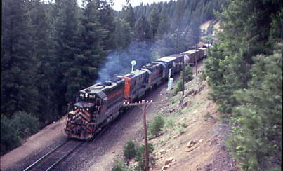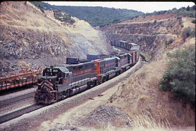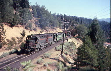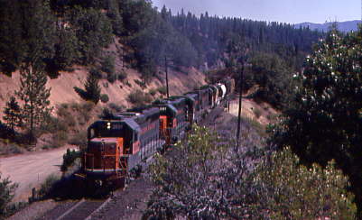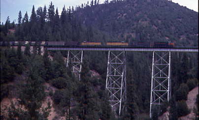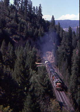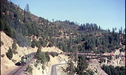 Jeff and I climbed the hill to get a shot of an eastbound near Merlin right above Rock Creek Bridge in 1978. Passing the Homeymoon Tunnels and the Serpertine Canyon, the bridge right before Keddie provided the view in 1981.