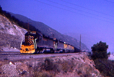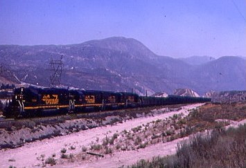5/31/1982 -- Denver and Rio Grande Western SD45 5317, built by Electro-Motive Division in 1967 and retired in 1995, drifted by the former Cajon Campground. It was sold to Progress Rail in October 1995 then to National