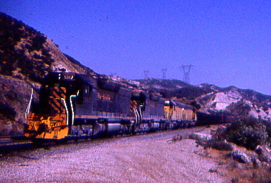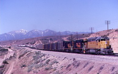 April 1988 -- Union Pacific 3924, leading two Rio Grande locomotives with the LAX in tow, passing through Lugo.