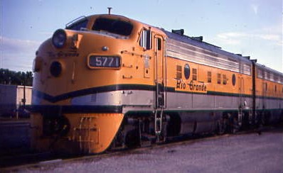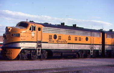 6/21/1982 -- Denver and Rio Grande Western F7A 5771, built by Electro-Motive Division in 1955 and retired in 1996. It was removed from regular Rio Grande Zephyr passenger service on 23 April 1983 and stored serviceable on 30 September 1984 after being used regularly on ballast unit trains. It is preserved at the Colorado Railroad Museum in Golden.